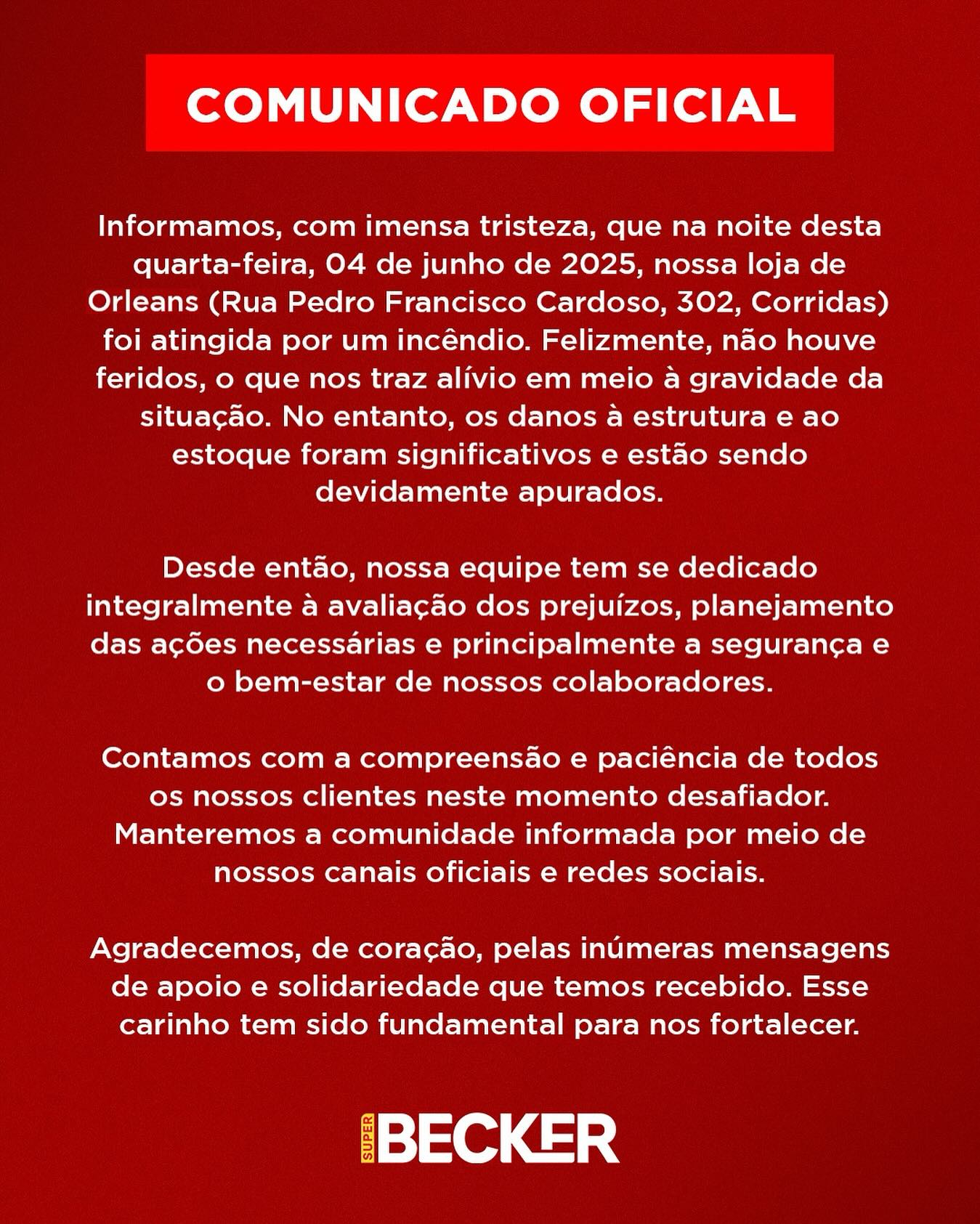 O Corpo de Bombeiros Militar de Orleans foi acionado às 20h52min do dia 04/06/2025, para atender um incêndio em estabelecimento comercial, na rua Francisco Assis Cardozo, no bairro Corridas, em Orleans. No local, foi constatado que se tratava de um incêndio em um dos pavilhões anexos ao mercado Becker, onde fica o estoque de produtos.