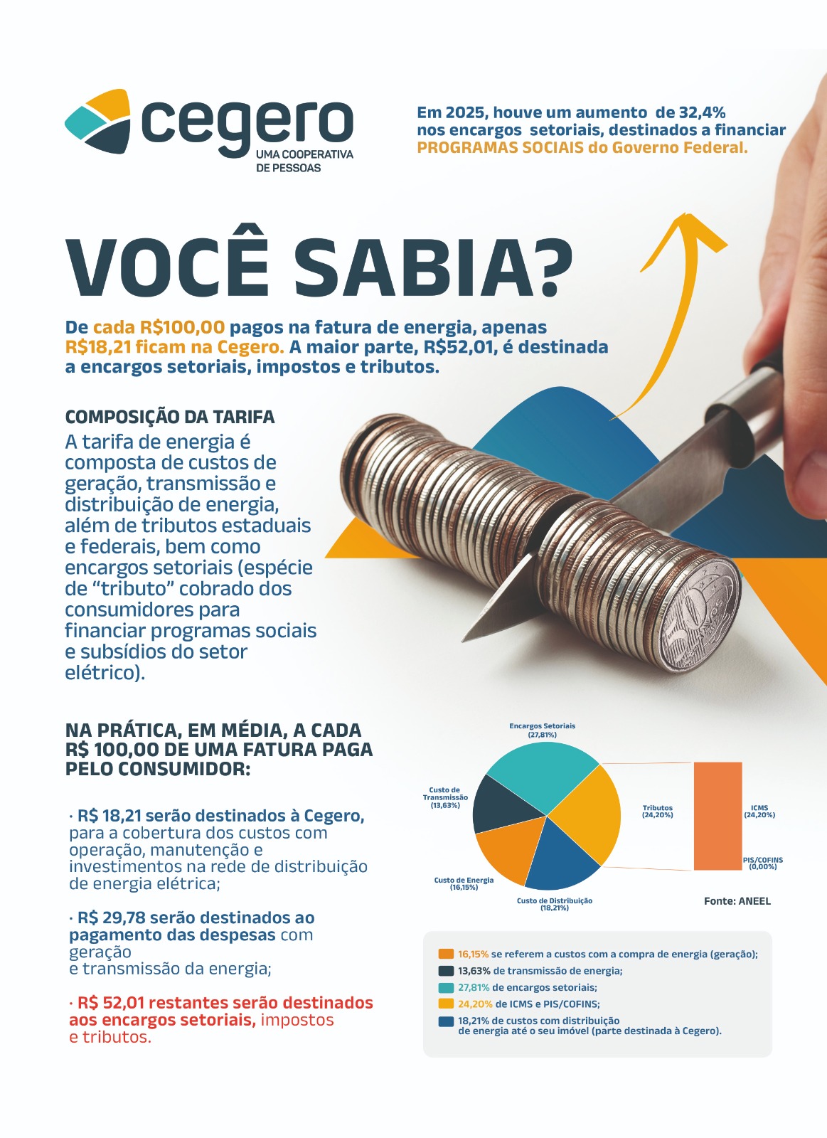 Enquanto a tarifa média nacional é 44% mais cara, a Cegero segue firme no compromisso de entregar energia de qualidade com preço justo.