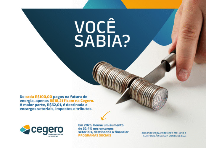 A resposta surpreende: de cada R$ 100,00 pagos, apenas R$ 18,21 ficam na Cegero, sendo este valor utilizado para cobrir os custos de operação, manutenção e investimentos realizados nas redes de distribuição de energia. O restante da fatura é destinado a outros componentes: