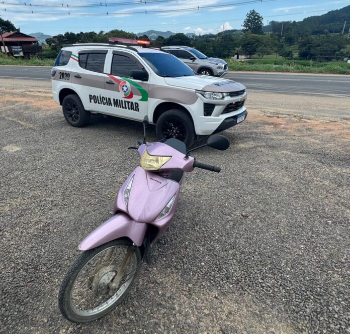 Um adolescente foi apreendido na tarde deste sábado (07), ao ser flagrado com uma moto furtada e drogas. De acordo com informações da Polícia Militar, durante o período da manhã, os policiais haviam registrado uma ocorrência de furto envolvendo uma motoneta.  Após o registro do boletim de ocorrência, policiais militares dos municípios de Braço do Norte e São Ludgero permaneceram em diligências e buscas com o objetivo de localizar o veículo.