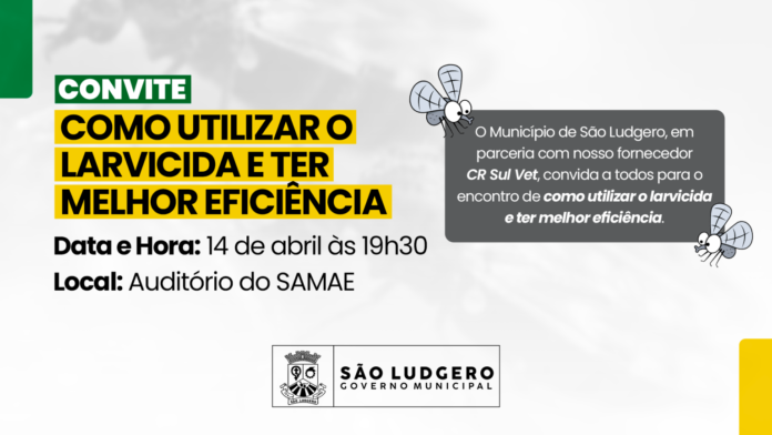 Governo Municipal de São Ludgero , por meio de uma ação conjunta entre a Secretaria de Agricultura, Piscicultura e Meio Ambiente e a Secretaria de Saúde, realiza no próximo dia 14 de abril um encontro técnico estratégico. O objetivo é orientar agricultores e a comunidade sobre a utilização correta e eficiente do larvicida, visando o controle de pragas e o fortalecimento das ações de vigilância epidemiológica.