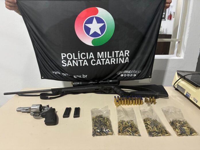 Os policiais realizaram buscas na residência e apreenderam um rifle calibre .22 com luneta, 485 munições intactas e dois carregadores, além de um revólver calibre .357 com 31 munições intactas e sete deflagradas.