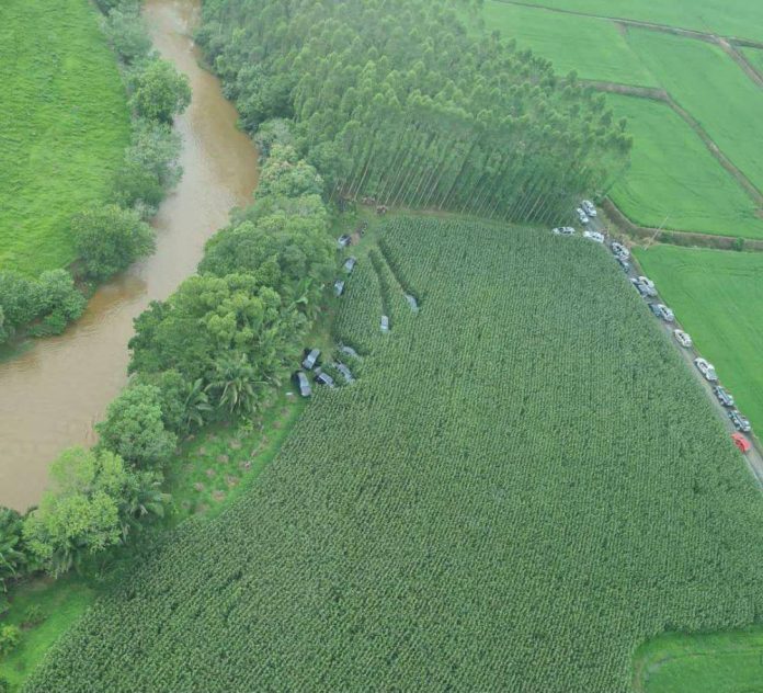Na localidade de Picadão, em Nova Veneza, foram encontrados dez veículos abandonados em meio a uma plantação de milho, ao lado de um rio, provavelmente usados na ação criminosa.
