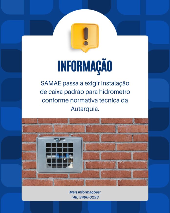 Para novas ligações de água, religações e pedidos de mudança de cavalete, passa a ser obrigatória a instalação da Caixa Padrão de Hidrômetro, conforme o novo padrão adotado pelo SAMAE de Orleans.