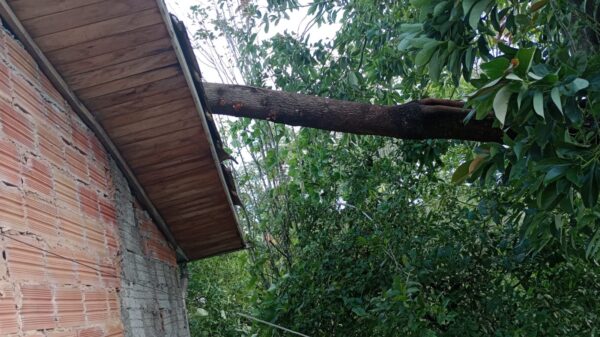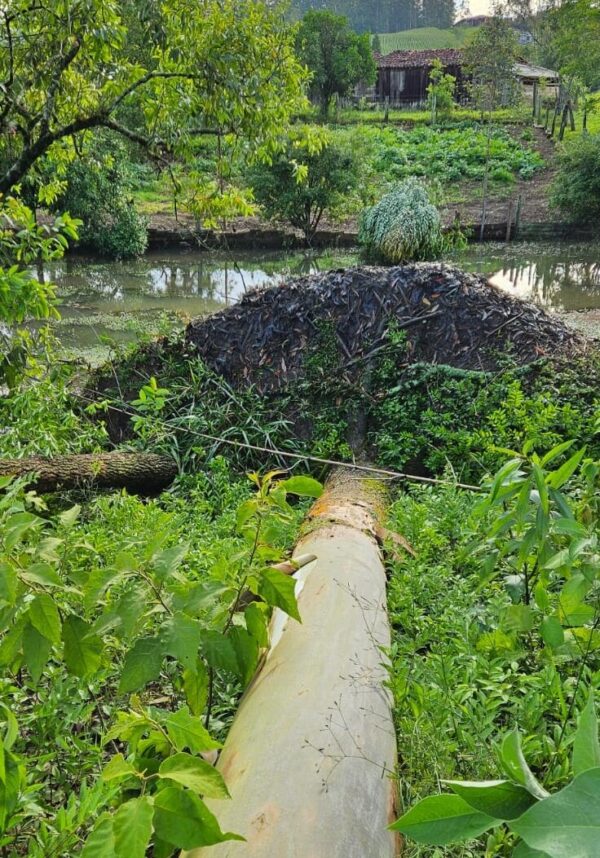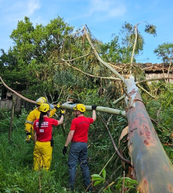 Logo após os bombeiros militares se deslocaram até o Loteamento Scussel, divisa entre Orleans e Urussanga, onde encontrou uma árvore nativa, arrancada pelas raízes, caída em cima da residência, danificando o telhado. Com o auxílio do motosserra, foi realizada a poda dos galhos que estavam sobre a residência e após foi realizado o corte do tronco pela parte debaixo até total desobstrução. O local foi deixado em segurança aos seus proprietários.