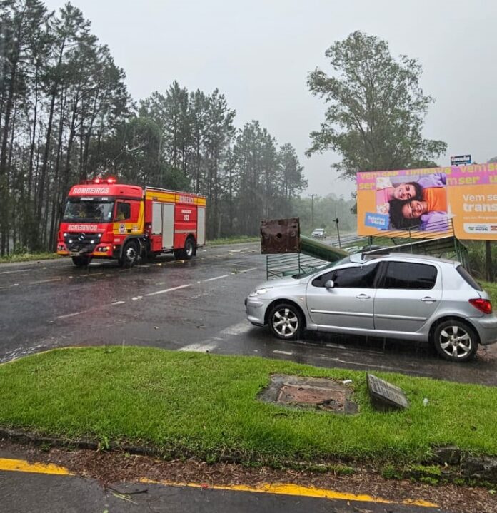 O primeiro atendimento foi realizado na Rodovia SC 108, no Bairro Murialdo, trevo de acesso a Unibave, onde uma grande placa de propaganda caiu sobre um veículo. Ao chegar no local, nossa equipe verificou que as três mulheres ocupantes do veículo, já haviam saído por meios próprios, sem lesões aparentes, porém assustadas. As mulheres deslocaram ao hospital em um segundo veículo tendo a proprietária acionado o seguro para procedimentos cabíveis. As informações foram repassadas a Central de Operações do Corpo de Bombeiros e da Policia Rodoviária Estadual.
