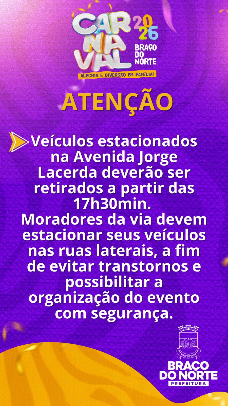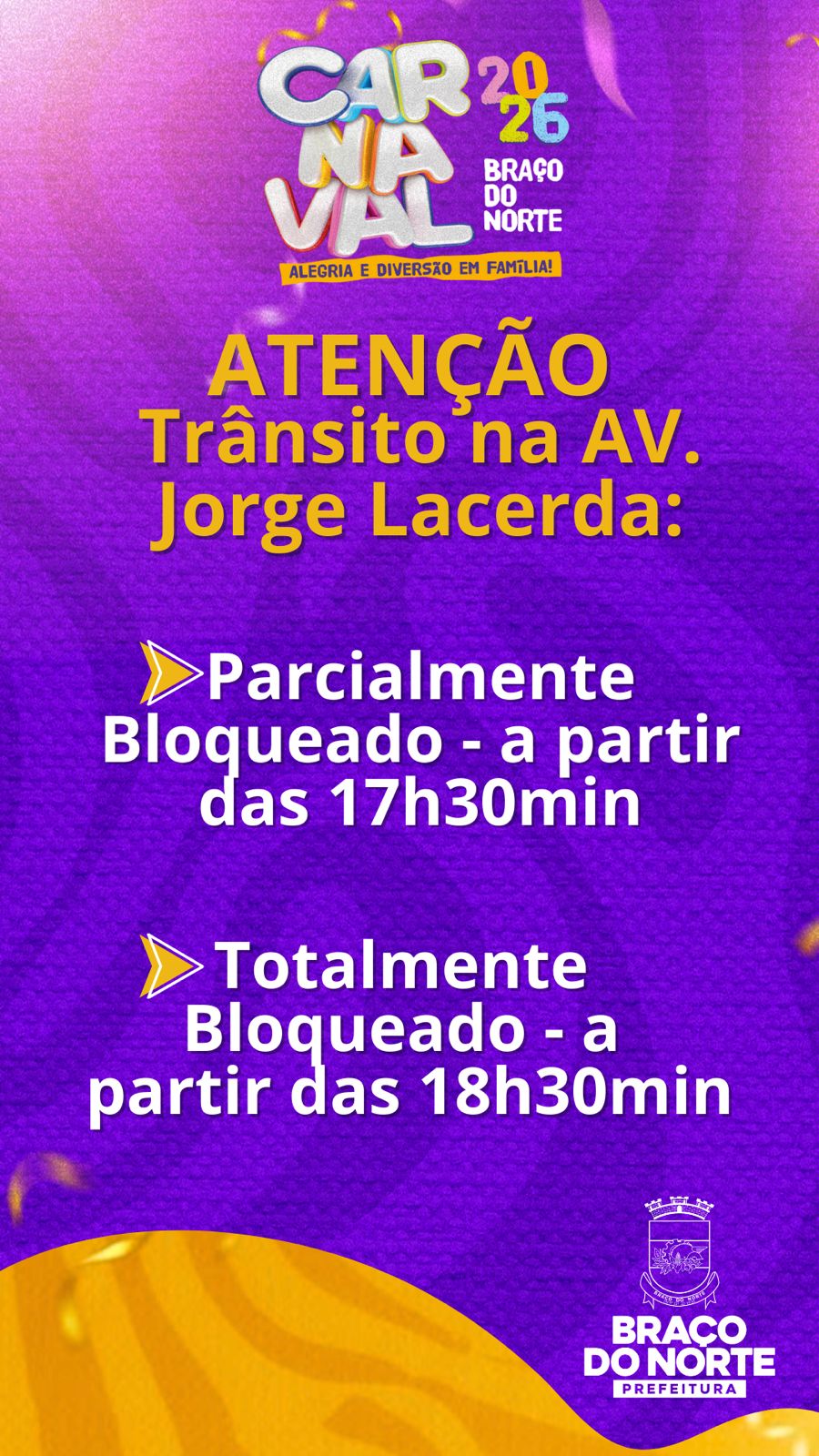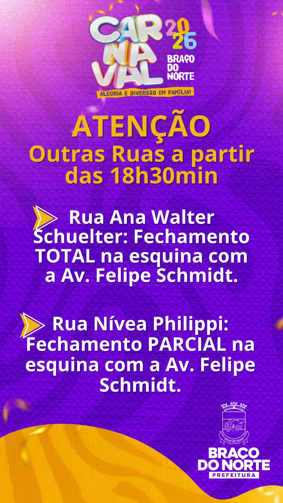 A Prefeitura de Braço do Norte informa que, em razão da realização do Carnaval 2026, haverá alterações no trânsito em algumas vias do município nesta sexta-feira.