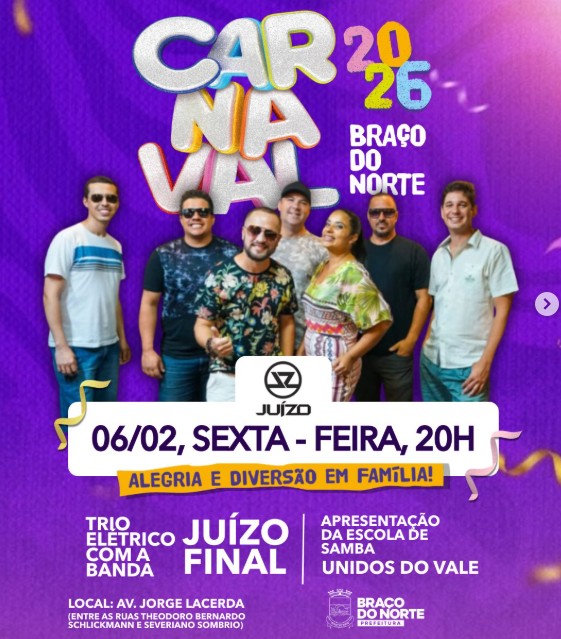 Trio elétrico com a banda Juízo Final, desfile da escola de samba Unidos do Vale e muita energia boa no ar! Entre as atrações confirmadas está a Banda Juízo Final, conhecida por animar o público com um repertório contagiante, garantindo a energia e a animação que já fazem parte da história do Carnaval de Braço do Norte.  Além do desfile da Escola de Samba Unidos do Vale.
