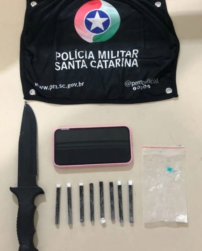 Durante a revista, foi encontrado com o homem, uma faca em sua cintura e na mesa onde estava o casal, uma carteira de cigarros com oito porções de cocaína prontas para a venda.