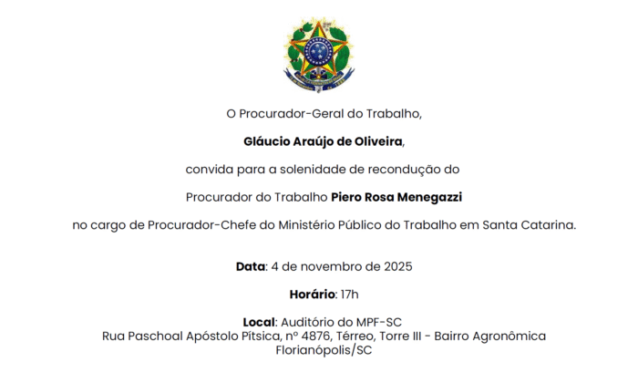 O Procurador do Trabalho Piero Rosa Menegazzi foi reconduzido ao cargo de Procurador-Chefe do MPT-SC, aclamado em 29 de agosto de 2025, por mais de 2/3 do Colégio de Procuradores da Regional.