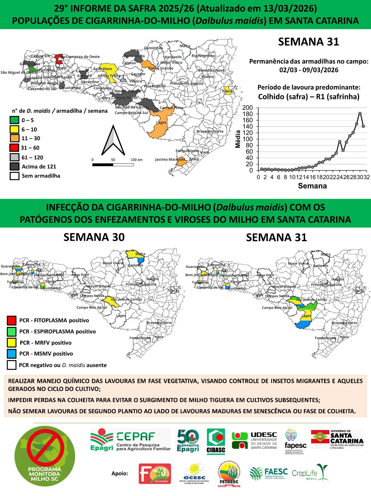 Santa Catarina registrou na última semana uma média de 140 cigarrinhas-do-milho por lavoura. O número, embora ainda elevado, representa um declínio de 12,5% em relação ao levantamento anterior. As cidades com mais insetos encontrados nas lavouras foram Porto União, São José do Cerrito, Campos Novos, Herval do Oeste, Xanxerê, Guatambu, Tunápolis e Guaraciaba.