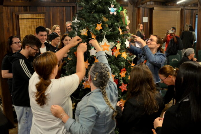 Os colaboradores do Centro Universitário Barriga Verde (UNIBAVE) participaram de um momento especial de confraternização e agradecimento pelo ano que se encerra. Assim como na edição anterior, todos foram convidados a escrever seus desejos e mensagens de felicitações natalinas em pequenas tags personalizadas, que foram penduradas na tradicional Árvore dos Sonhos, montada coletivamente no Centro de Vivências da instituição.