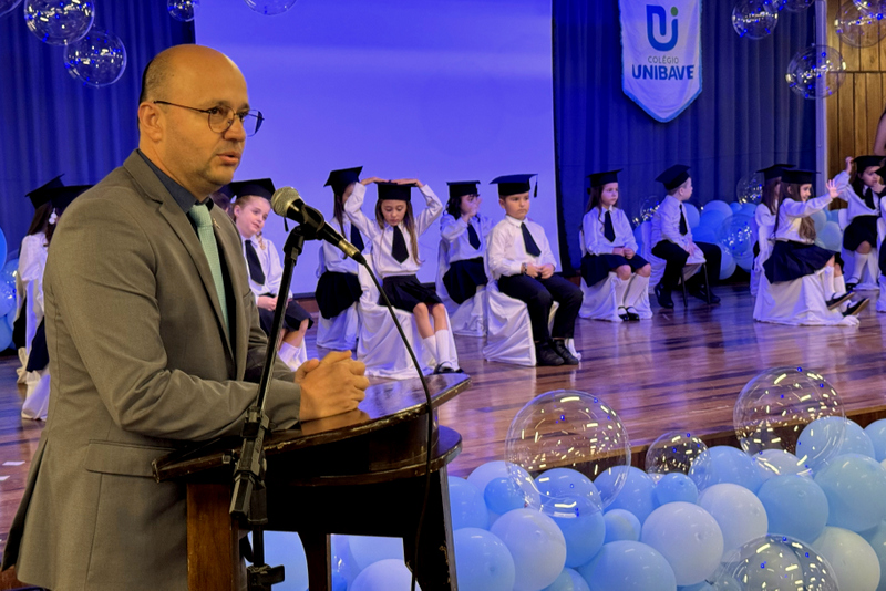 Com o tema “Tesouros do Mar Azul”, a cerimônia utilizou elementos simbólicos do oceano para representar as descobertas vividas pelas crianças ao longo do ano. A diretora do Colégio Unibave, professora Jucinara Teixeira Formanski, acompanhou o evento e celebrou com as famílias esse importante ciclo. Ao lado dela, estiveram presentes o presidente da Fundação Educacional Barriga Verde (Febave) e reitor do Unibave, professor Guilherme Valente de Souza, além da coordenadora da Educação Infantil, professora Vanessa Thatiana Silva de Andrade, e demais educadores que fazem parte da trajetória dos pequenos.