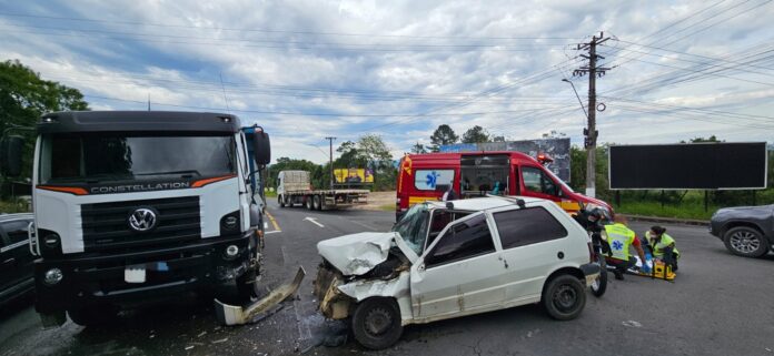 A colisão aconteceu em frente ao quartel do Corpo de Bombeiros de Orleans e envolveu um caminhão VOLKSWAGEN/31320, um automóvel FIAT UNO e uma motocicleta HONDA/CG 125.