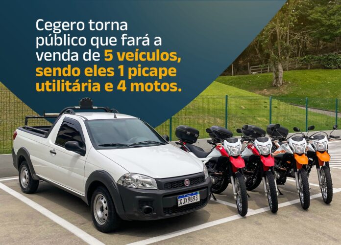 A Cooperativa de Eletricidade de São Ludgero – CEGERO torna pública a venda de cinco veículos, sendo eles uma picape utilitária e quatro motos, conforme as condições a seguir: