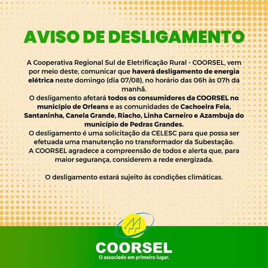 A Cooperativa Regional Sul de Eletrificação Rural – COORSEL, vem por meio deste, comunicar que haverá desligamento de energia elétrica neste domingo (dia 07/08), no horário das 06h às 07h da manhã. O desligamento afetará todos os consumidores da COORSEL no município de Orleans e as comunidades de Cachoeira Feia, Santaninha, Canela Grande, Riacho, Linha Carneiro e Azambuja do município de Pedras Grandes.