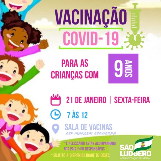 São Ludgero aplica a vacina contra Covid-19 amanhã, sexta-feira, 21 de janeiro, das 7 às 12 horas, em crianças com 9 anos. Será na Sala de Vacinas, na ESF Margem Esquerda.