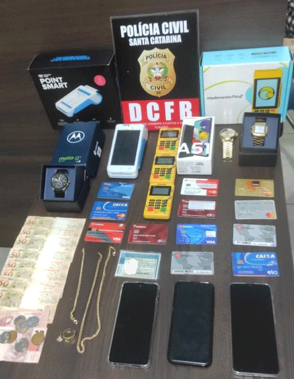 Com o suspeito os policiais apreenderam o cartão de uma das vítimas, já no quarto em que ele se encontrava hospedado, os policiais encontraram máquinas de cartão de crédito/débito, cartões de crédito/débito e outros objetos adquiridos com os valores ilícitos obtidos através dos golpes.