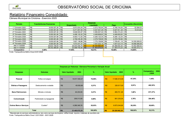 O Observatório Social de Criciúma divulgou a análise do Relatório Financeiro Consolidado da Câmara Municipal referente ao exercício de 2025. Os dados apontam um aumento de 18,31% nas despesas liquidadas, que passaram de R$ 21,4 milhões em 2024 para R$ 25,3 milhões em 2025. O crescimento ocorre principalmente em despesas de custeio, comunicação e aquisição de bens patrimoniais.