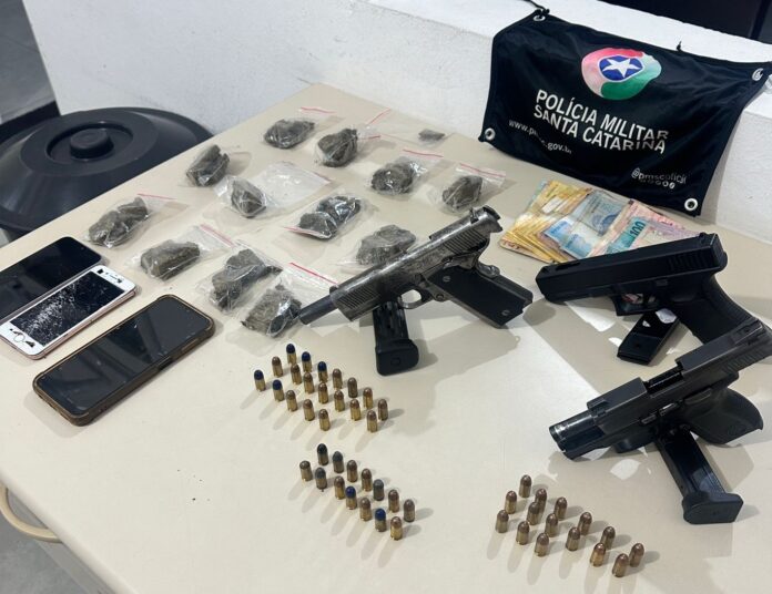 Diante do flagrante delito, foi realizada a entrada no imóvel sendo abordado um masculino. Na cama havia duas pistolas carregadas ao seu lado, além de munições, sendo apreendidas 01 pistola Imbel .380, municiada com 19 munições, 01 pistola Taurus 638 municiada, com 15 munições, além de 14 munições e a quantia de R$ 1.334 em dinheiro. Neste quarto, também havia 11 porções de maconha embaladas prontas para venda, 01 celular, além do celular jogado ao solo.