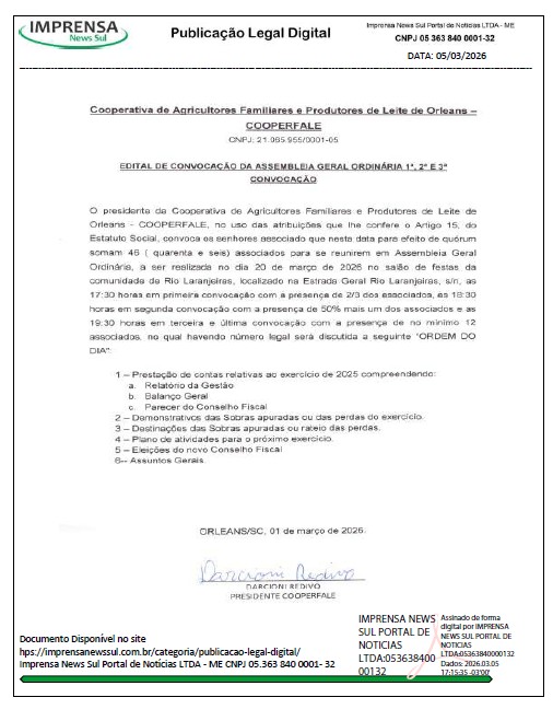 O presidente da Cooperativa de Agricultores Familiares e Produtores de Leite de Orleans COOPERFALE, no uso das atribuições que lhe confere o Artigo 15, do Estatuto Social, convoca os senhores associado que nesta data para efeito de quórum somam 46 (quarenta e seis) associados para se reunirem em Assembleia Geral Ordinária, a ser realizada no dia 20 de março de 2026 no salão de festas da comunidade de Rio Laranjeiras, localizado na Estrada Geral Rio Laranjeiras, s/n, as 17:30 horas em primeira convocação com a presença de 2/3 dos associados, аз 18:30 horas em segunda convocação com a presença de 50% mais um dos associados e as 19:30 horas em terceira e última convocação com a presença de no mínimo 12 associados, no qual havendo número legal será discutida a seguinte “ORDEM DO DIA”: