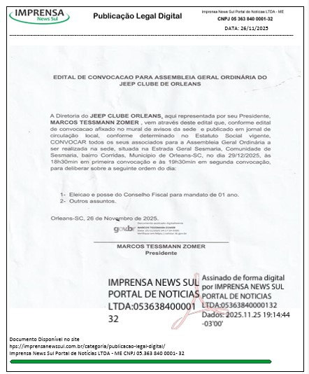 A Diretoria do JEEP CLUBE ORLEANS, aqui representada por seu Presidente, MARCOS TESSMANN ZOMER, vem através deste edital que, conforme edital de convocação afixado no mural de avisos da sede e publicado em jornal de circulação local, conforme determinado no Estatuto Social vigente, CONVOCAR todos os seus associados para a Assembleia Geral Ordinária a ser realizada na sede, situada na Estrada Geral Sesmaria, Comunidade de Sesmaria, bairro Corridas, Município de Orleans-SC, no dia 29/12/2025, às 18h30min em primeira convocação e às 19h30min em segunda convocação, para deliberar sobre a seguinte ordem do dia: