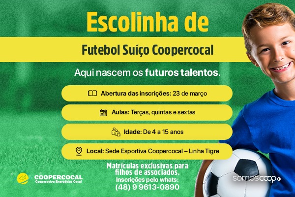 A Coopercocal abre, na próxima segunda-feira, dia 23 de março, as inscrições para a Escolinha de Futebol Suíço. O projeto é voltado para crianças e adolescentes de 4 a 15 anos e será realizado na sede esportiva da cooperativa, na Linha Tigre.