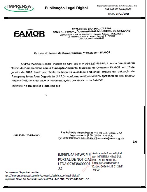 Andréa Masieiro Coelho, inscrito no CPF sob o nº 054.327.569-86, informa que celebrou Termo de Compromisso com a Fundação Ambiental Municipal de Orleans – FAMOR, em 15 de janeiro de 2026, tendo por objeto melhoria na qualidade ambiental, através da realização da Recuperação da Área Degradada (PRAD), conforme relatório técnico apresentado pelo técnico responsável, considerando as recomendações dos técnicos da FAMOR.