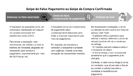 Na modalidade investigada, o envioou retirada do item ocorre por meio doserviço Uber Flash.- O golpista utiliza o aplicativo parasolicitar o serviço, definindo o ponto deretirada (local da vítima) e o endereçode entrega.- O motorista parceiro realiza a coleta eo transporte do objeto.- A vítima entrega o item ao motoristaacreditando que o pagamento já foiefetuado.Contudo, o valor nunca chega à contado vendedor, que só percebe a fraudeao conferir o extrato bancário econstatar a inexistência dopagamento.