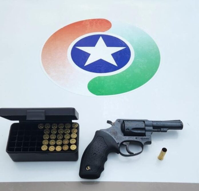 Diante das informações, os policiais realizaram varredura na área indicada e localizaram um revólver calibre .38, além de uma caixa contendo 26 munições intactas e uma munição deflagrada no tambor da arma. O aparelho celular do suspeito também foi apreendido. A faca mencionada não foi localizada.