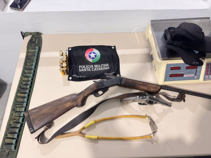 Conforme a PM, durante a abordagem ao veículo, que estava estacionado nas proximidades do bar, os policiais localizaram duas armas de fogo, sendo um revólver e uma espingarda, além de 14 munições de espingarda intactas e prontas para uso. O suspeito confirmou aos policiais que as armas e o veículo eram de sua propriedade.