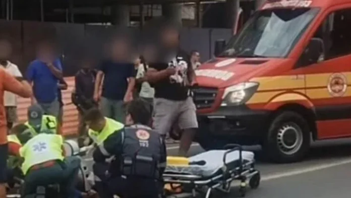 Na chegada da guarnição, um bombeiro militar de folga já prestava os primeiros socorros à vítima, que apresentava parada cardiorrespiratória, traumatismo cranioencefálico (TCE) e escoriações generalizadas pelo corpo.