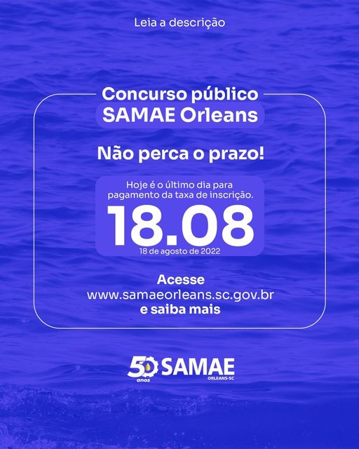 O concurso público do SAMAE de Orleans, quem ainda não efetuou o pagamento da taxa, não perca tempo, pois o prazo encerra, dia 18 de agosto.