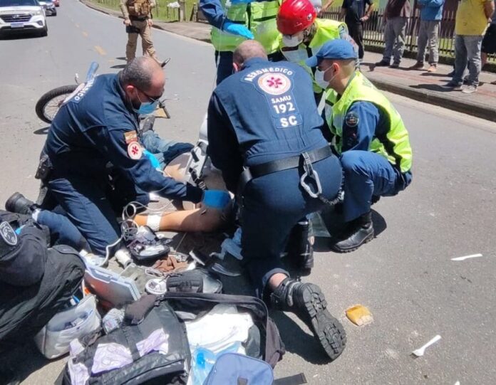 O SAER SAMU AEROMÉDICO foi acionado pelo Corpo de Bombeiros Militar para atendimento onde um masculino com cerca de 30 anos, piloto da motocicleta, recebia massagem cardíaca de um popular com treinamento.