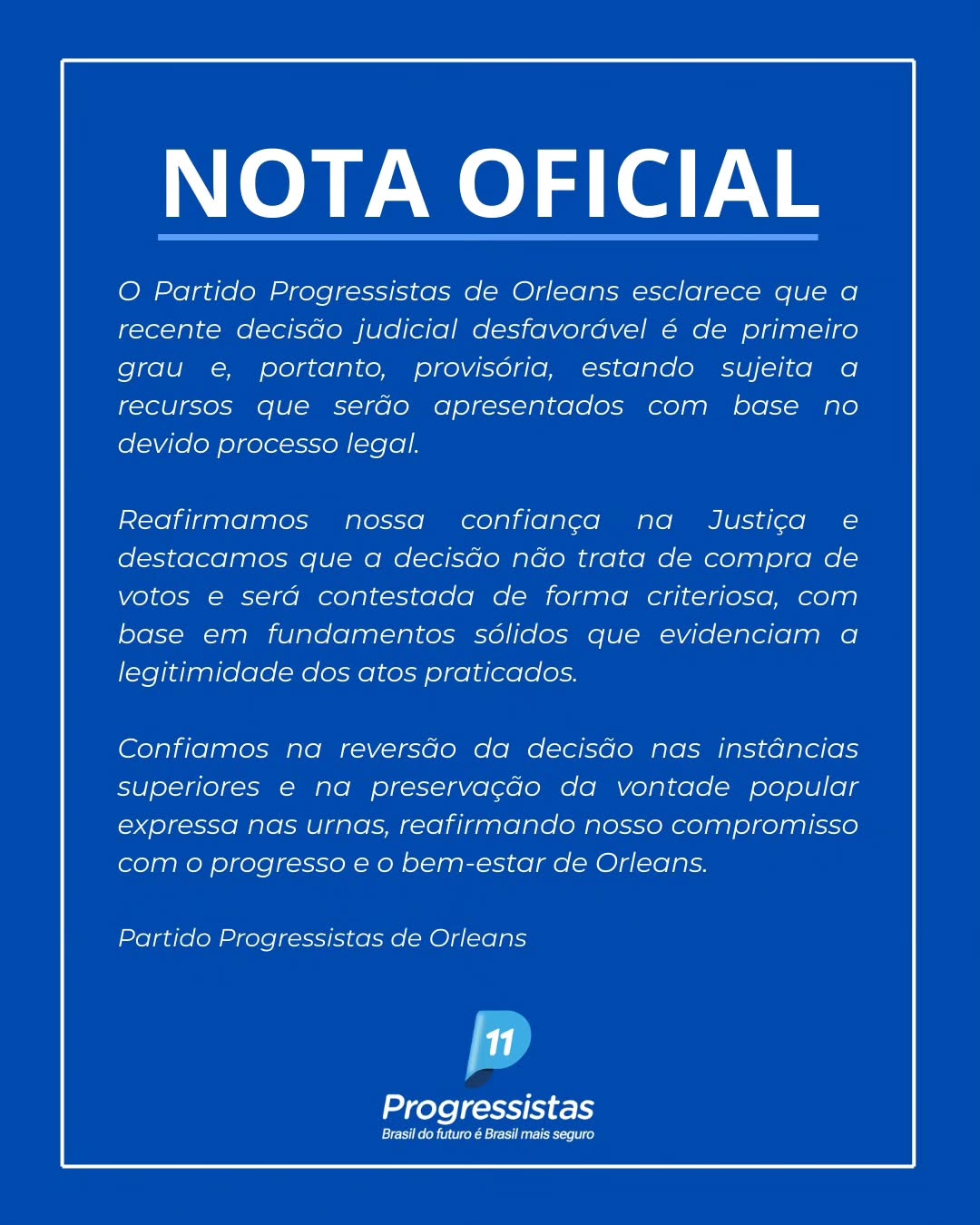 “O Partido Progressistas de Orleans/SC esclarece que a recente decisão judicial desfavorável é de primeiro grau e, portanto, provisória, estando sujeita a recursos que serão apresentados com base no devido processo legal.