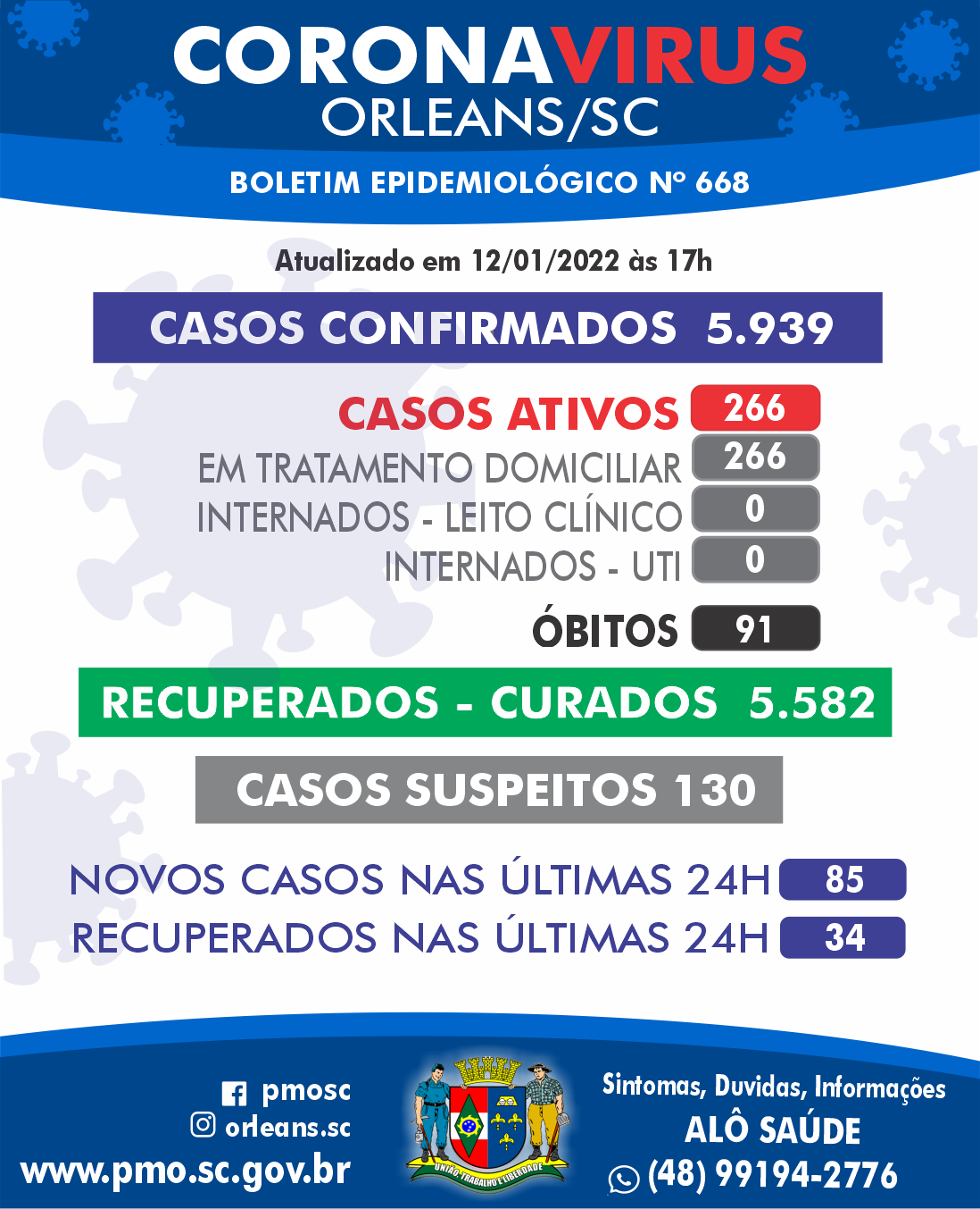 Orleans registrou 266 casos ativos de Covid-19 no município nesta quarta-feira, 12 de janeiro de 2022. Nas últimas 24 horas foram registrados 85 novos casos. Todos os pacientes estão em tratamento domiciliar. Cerca de 34 pessoas foram consideradas recuperadas.