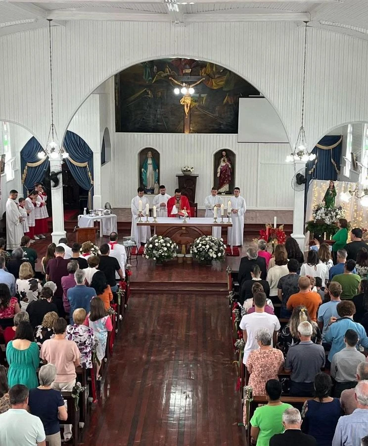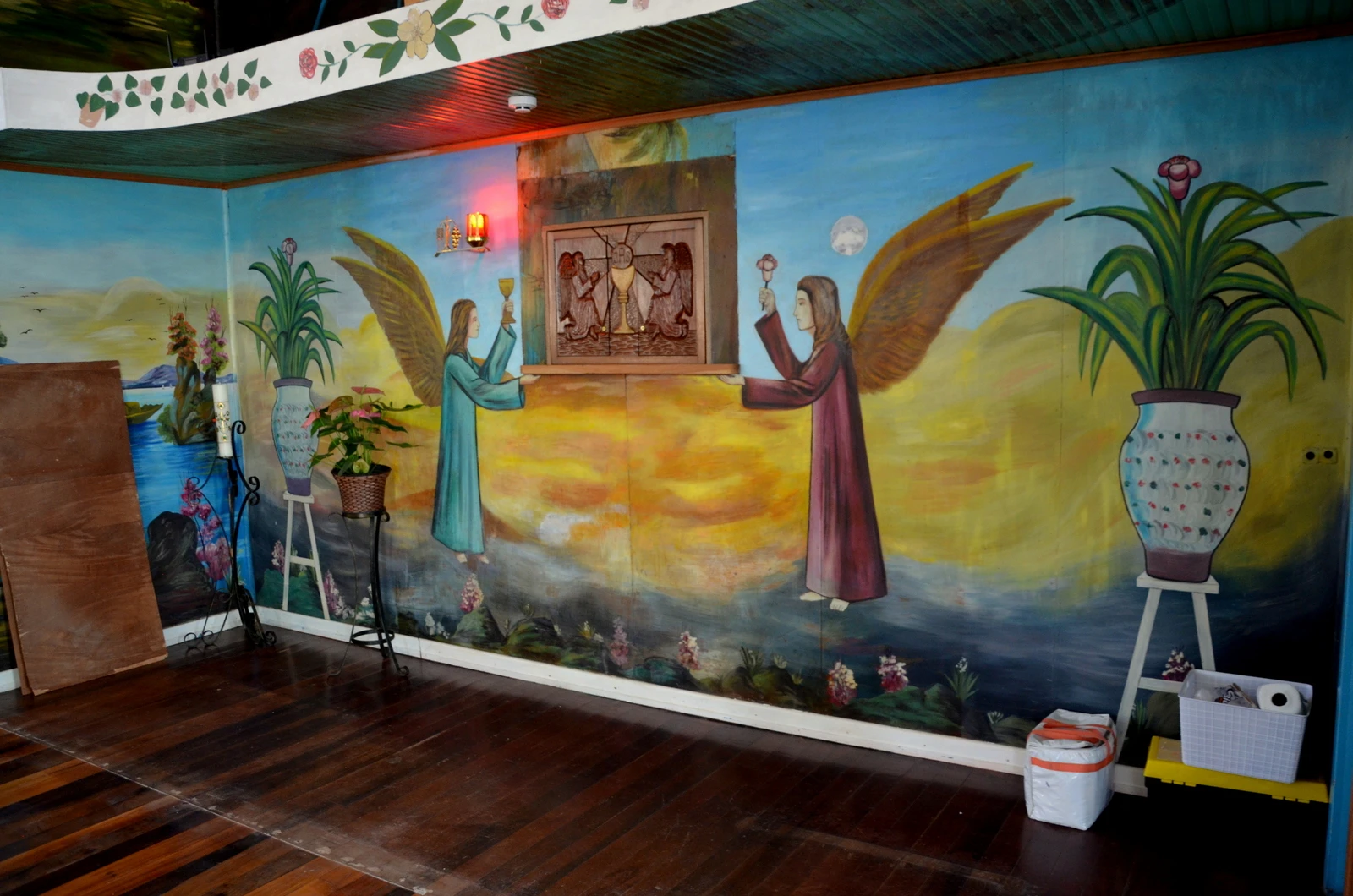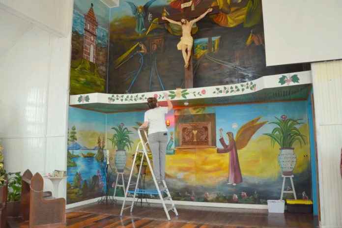 Conforme Nani, o painel foi pintado nos anos 70. Depois, a parte de baixo foi coberta com carpete, o que acabou manchando a obra com cola. Logo depois, nos anos 2000, a obra foi coberta com ripas de madeira, permanecendo 25 anos escondida, como mostra a foto da Festa de Santa Bárbara de 2023.
