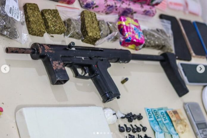 No local, os militares abordaram o morador, que confessou a informação repassada. Dentro da residência, foram apreendidos 522 comprimidos de ecstasy, um quilo de cocaína, três quilos de maconha, duas balanças de precisão, 350 reais em dinheiro, e uma submetralhadora (calibre 380) artesanalmente modificada. O criminoso foi preso e conduzido até a Delegacia de Polícia Civil, juntamente com todo o material ilícito apreendido.