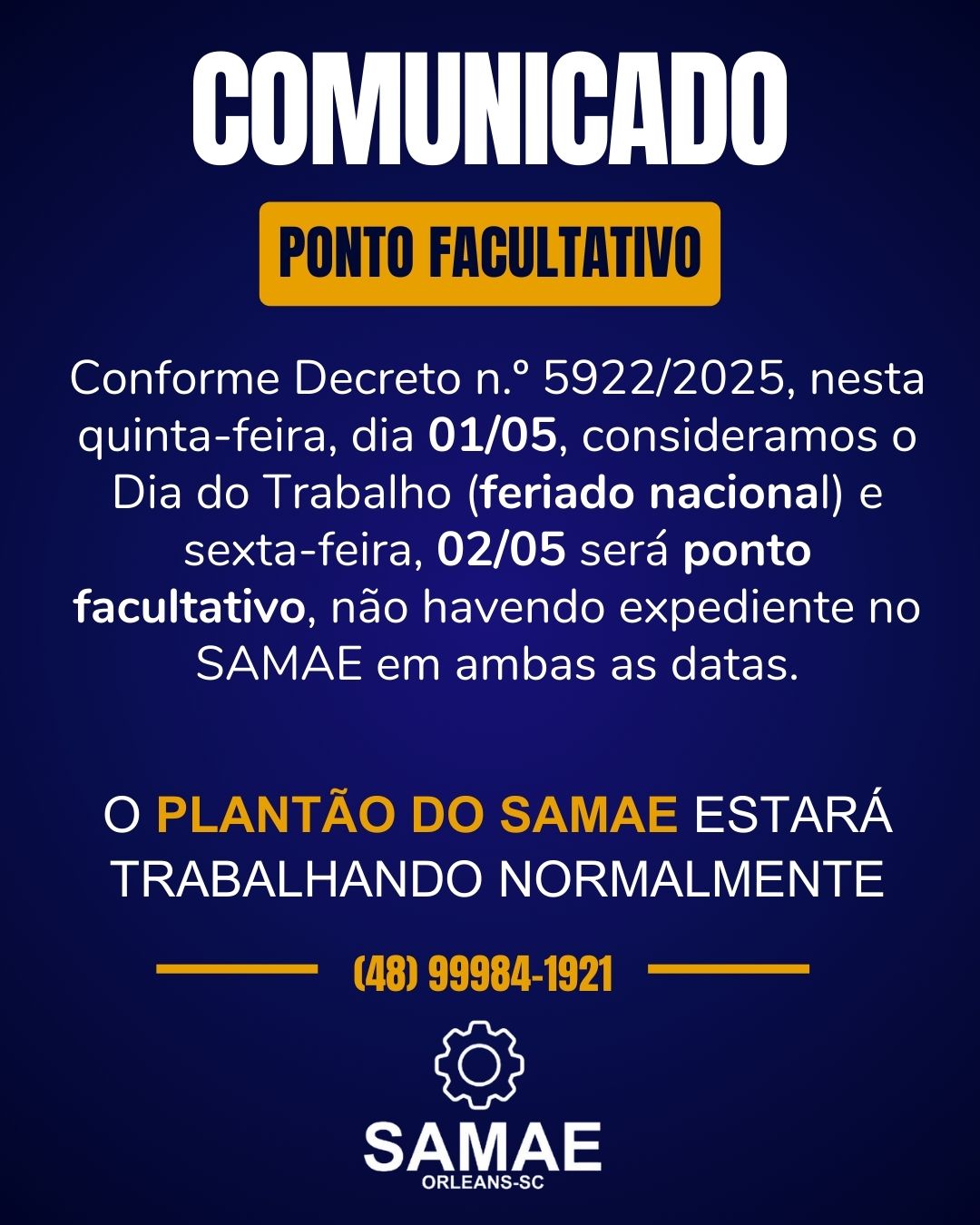 “Conforme Decreto n. º 5922/2025, informamos que quinta-feira (01/05) será feriado nacional em comemoração ao Dia do Trabalho, e sexta-feira (02/05) será ponto facultativo, portanto não haverá expediente no SAMAE nessas datas. O plantão do SAMAE seguirá funcionando normalmente. Em caso de urgência, entre em contato pelo telefone: (48) 99984-1921”.