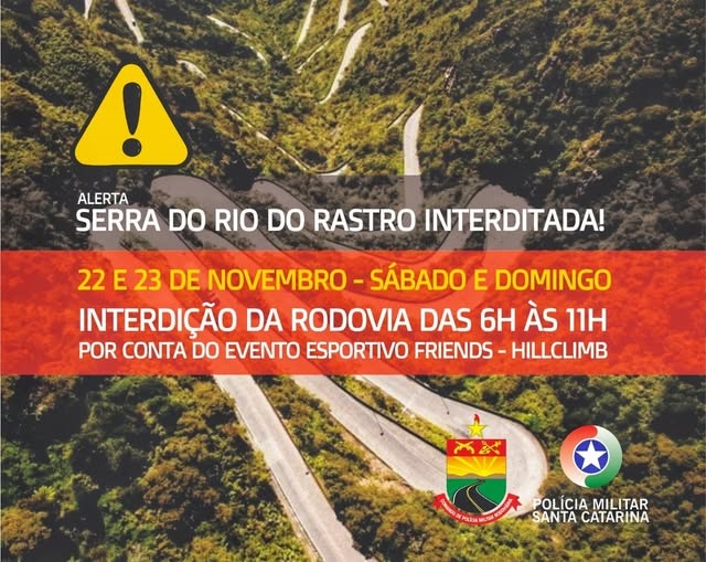 O Comando de Polícia Militar Rodoviária informa aos usuários da SC-390, que a Serra do Rio do Rastro, em Bom Jardim da Serra, estará interditada nos dias 22 e 23 de novembro, das 6h às 11 horas, para a realização do evento esportivo Friens – Hillclimb