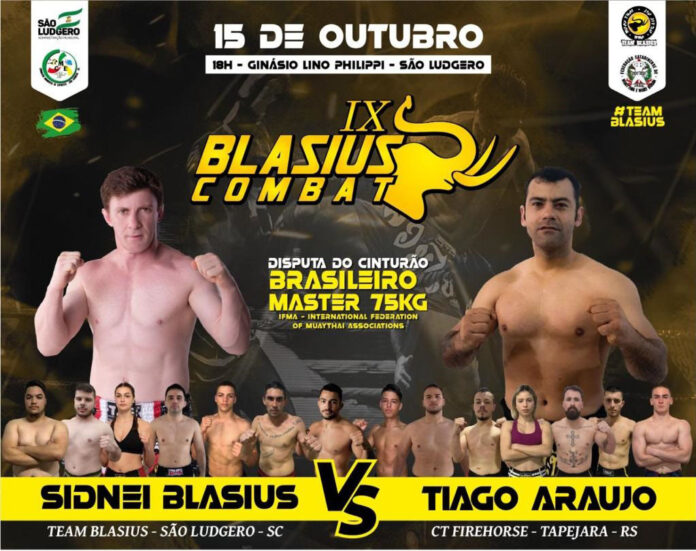 Muitas emoções ao público. Essas são as expectativas para o IX Blasius Combat. O lutador Sidnei Blasius após alguns anos retorna com força total ao ringue. Ele disputará o Cinturão Brasileiro de Muay Thai Master 75 kg, dia 15 de outubro, no Ginásio Municipal Lino Philippi, em São Ludgero, contra Tiago Araújo, do Rio Grande do Sul. Ao todo serão 16 lutas, 14 de Muay Thai e duas de MMA, com início às 18 horas. O evento conta com apoio da Prefeitura de São Ludgero, por meio da Secretaria de Educação, Cultura e Esportes/Comissão Municipal de Esportes (CME).