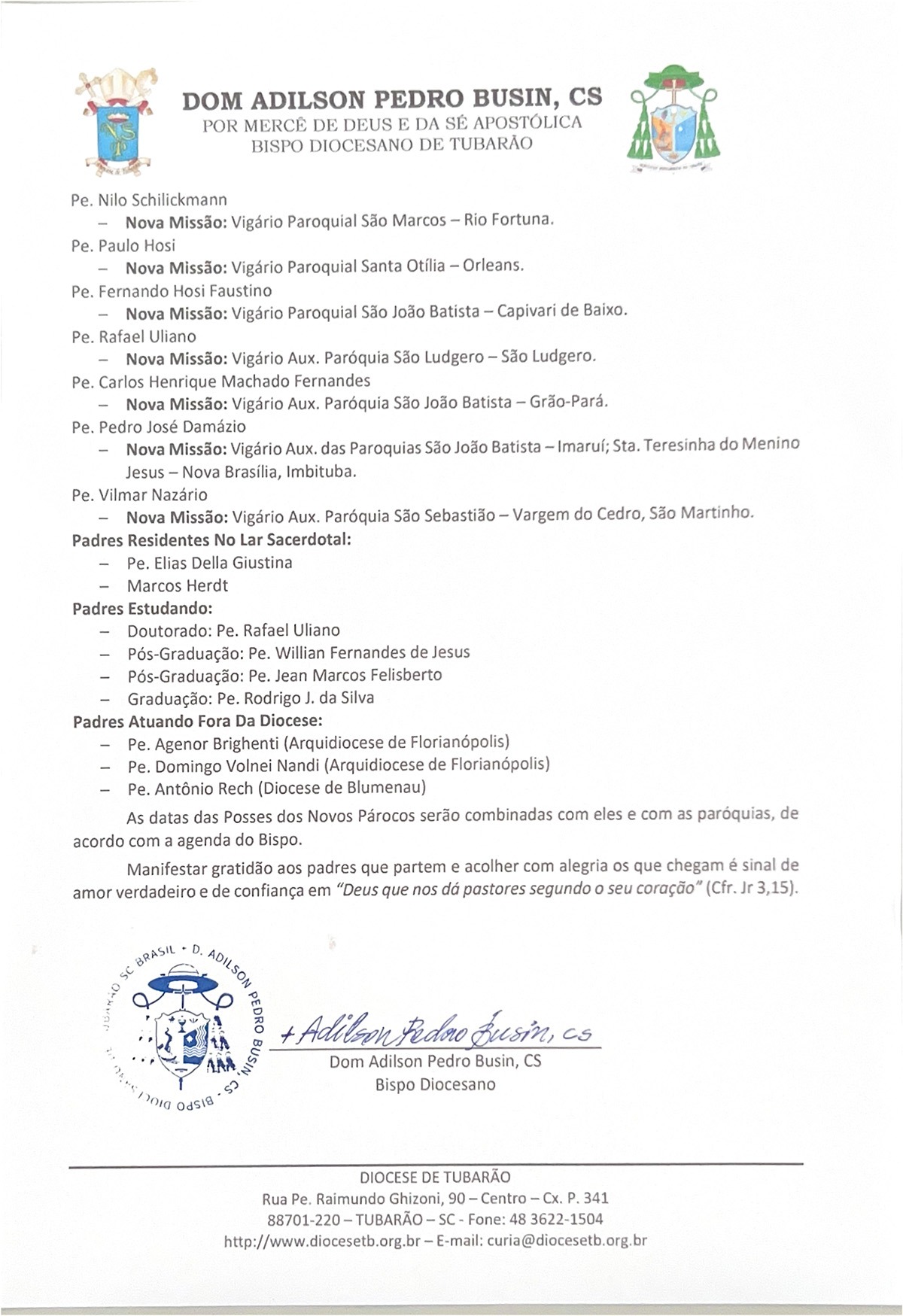 Conforme o bispo, as transferências valem para algumas paróquias da região, incluindo Braço do Norte, Imbituba, Imaruí, Rio Fortuna, Tubarão. As datas das posses serão combinadas com os mesmos segundo a agenda do bispo.