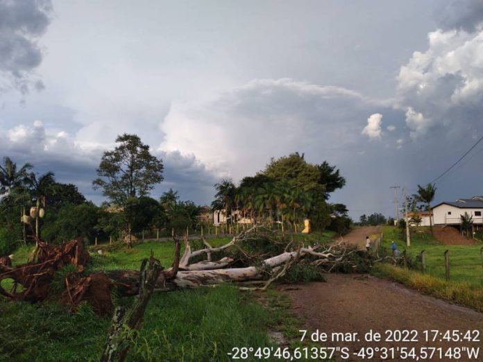 Um temporal registrado na tarde desta segunda-feira, dia 7, por volta das 16h30, provocou destelhamentos, quedas de árvores e postes em Forquilhinha tanto na área urbano quanto rural. Também houve registro de granizo.